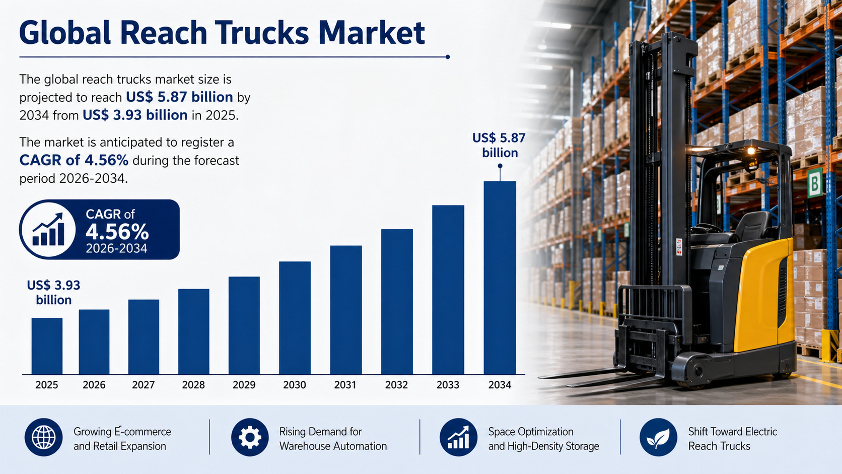 The global reach trucks market size is projected to reach US$ 5.87 billion by 2034 from US$ 3.93 billion in 2025. The market is anticipated to register a CAGR of 4.56% during the forecast period 2026-2034. As the global logistics landscape evolves, the demand for high-density storage solutions has surged, positioning reach trucks as a vital asset for modern warehouse management. These vehicles are specifically engineered to navigate narrow aisles and provide exceptional vertical reach, allowing businesses to maximize their storage capacity without expanding their physical footprint.
