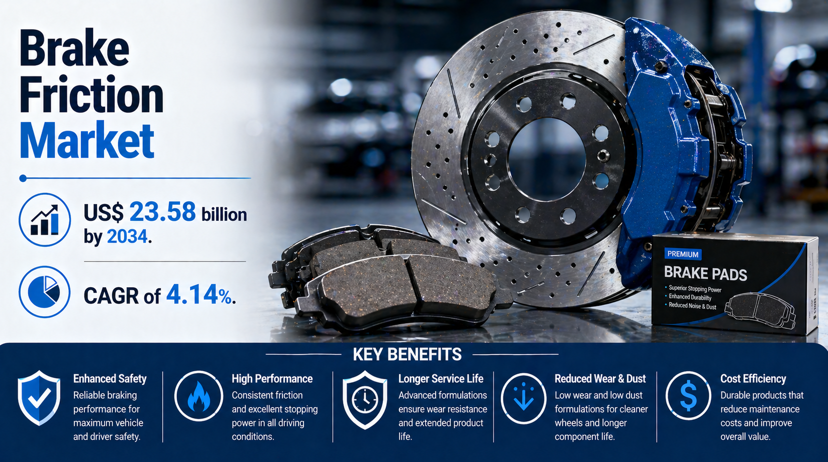 The global automotive components sector is entering a transformative phase where safety performance and environmental compliance are driving significant investment in braking technologies. As vehicle manufacturers focus on enhancing stopping distances and reducing noise, the demand for advanced friction materials is set for steady expansion. The Brake Friction Market is projected to reach US$ 23.58 billion by 2034 from US$ 16.37 billion in 2025. The market is anticipated to register a CAGR of 4.14% during the forecast period 2026-2034.