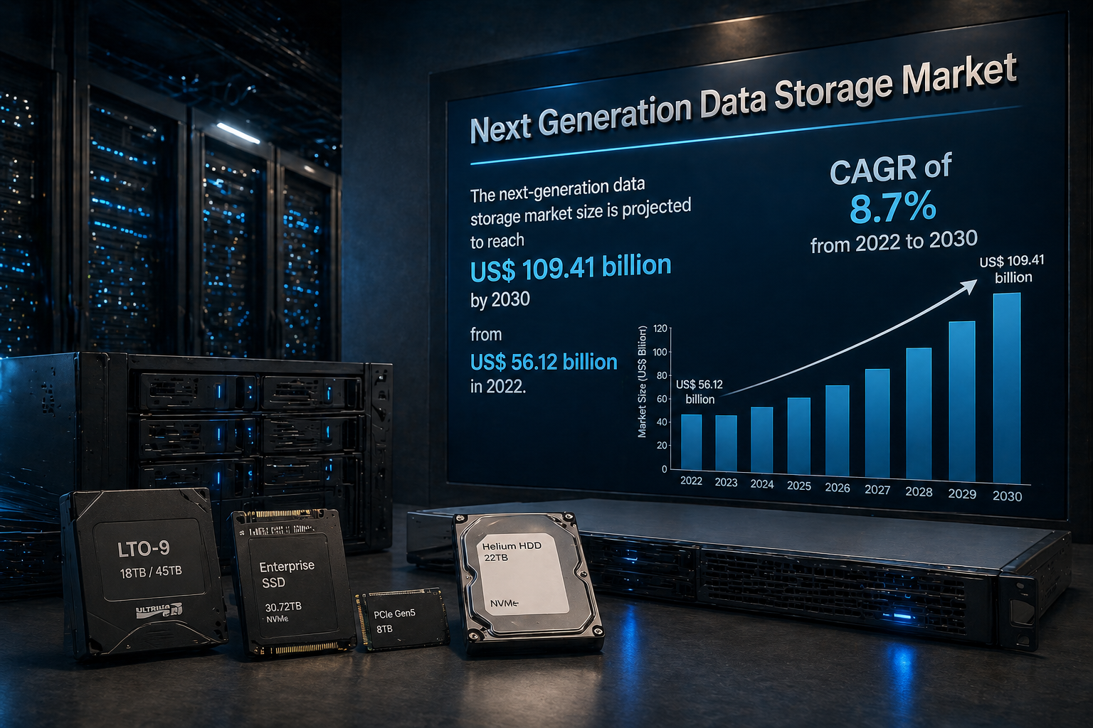 The Next Generation Data Storage Market is experiencing significant growth driven by increasing data generation and demand for efficient storage solutions. According to The Insight Partners, the market is projected to grow from US$ 56.12 billion in 2022 to US$ 109.41 billion by 2030, registering a CAGR of 8.7% during the forecast period. For detailed insights, refer to the Next Generation Data Storage Market Growth, where advancements in storage technologies and rising enterprise adoption are key factors supporting expansion.