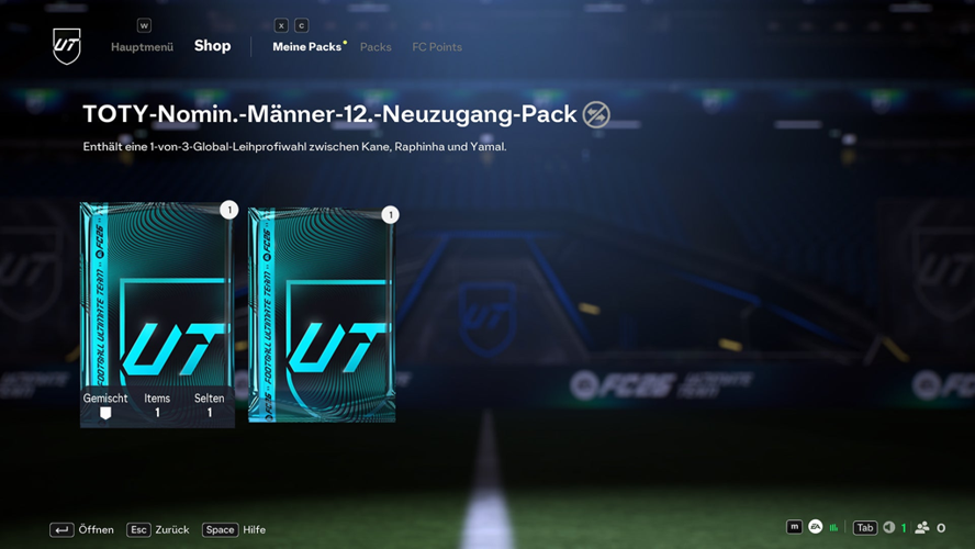 Im Shop findest du dann die „TOTY-Nomin.-Männer-12.-Neuzugang-Pack“ für den männlichen Kandidaten und die „TOTY-Nomin.-Frauen-12.-Neuzugang-Pack“ für die weibliche Wahl. Öffne diese Packs nacheinander, um deine Stimme für jeweils einen der drei vorgeschlagenen Profis abzugeben. Falls du die Meldung nicht siehst, kannst du die Spieleroptionen auch unter „Meine Packs“ finden und dort deine Entscheidung treffen.