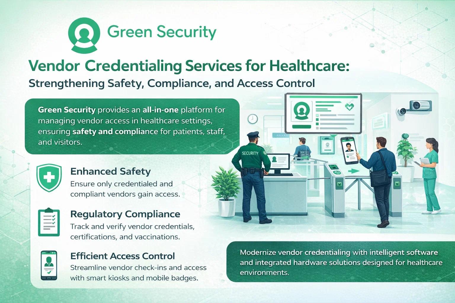 As healthcare compliance standards continue to evolve, hospitals need reliable, scalable tools to manage vendor access and documentation. Green Security’s advanced mobile credentialing solution delivers improved oversight, faster workflows, and stronger regulatory alignment.