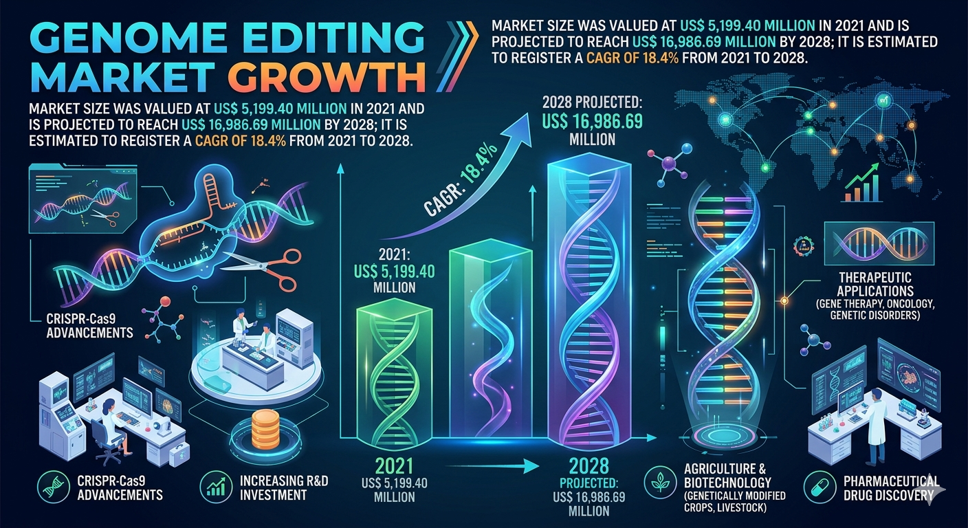 The global genome editing market  Analysis and Overview is on a transformative growth trajectory. Valued at US$ 5,199.40 million in 2021, the market is projected to reach US$ 16,986.69 million by 2028, registering a strong CAGR of 18.4% over the forecast period (2022–2028). This remarkable expansion is being fueled by converging forces — from surging disease prevalence and breakthrough CRISPR technologies to escalating R&D investment and a global pivot toward precision medicine.