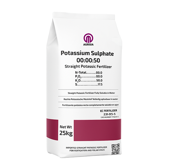 AGRISIA NPK 00:00:50 supplies a powerful combination of potassium and sulphur in an available form. Potassium plays a major role in regulating physiological processes in plants such as enzyme activation, photosynthesis, and water regulation. Sulphur supports protein formation and enhances chlorophyll development, contributing to greener and healthier crops.