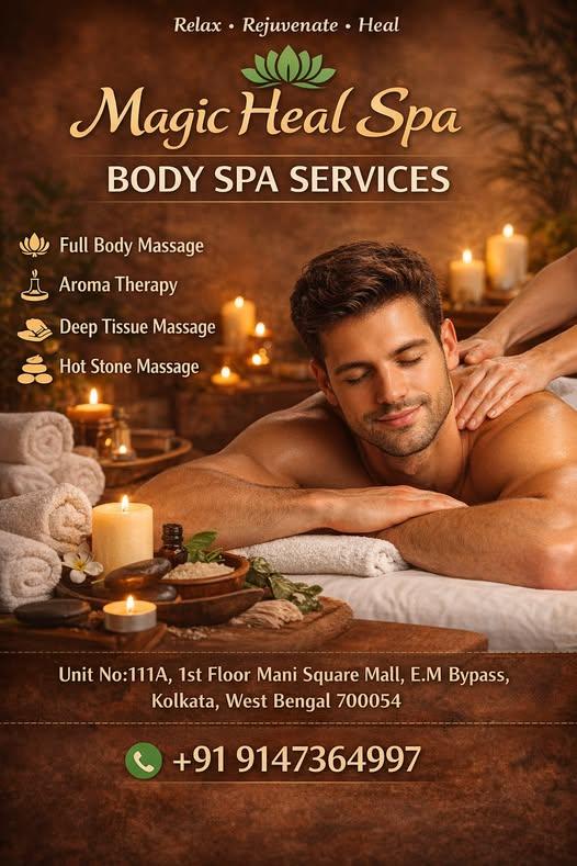 Experience the perfect balance of relaxation, rejuvenation, and healing at Magic Heal Spa, your trusted destination for premium body spa services in Kolkata. Located at Unit No. 111A, 1st Floor, Mani Square Mall, E.M. Bypass, Kolkata – 700054, we offer a serene escape from the stress and demands of everyday life. Step into our calming space filled with warm candlelight, soothing aromas, and a tranquil atmosphere designed to refresh your body and mind.