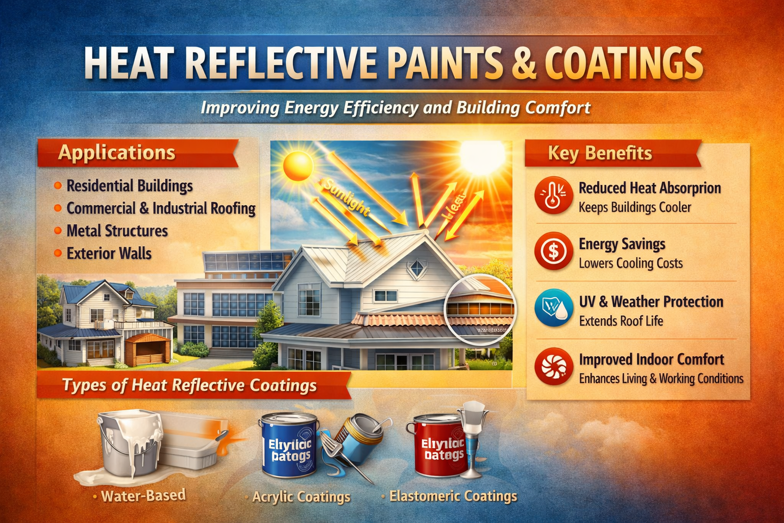 Heat reflective paints and coatings help maintain stable temperatures in buildings and infrastructure, enhancing occupant comfort, lowering cooling costs, and contributing to environmental sustainability. Industries such as construction, automotive, and infrastructure increasingly rely on these coatings to meet regulatory standards and performance expectations.
