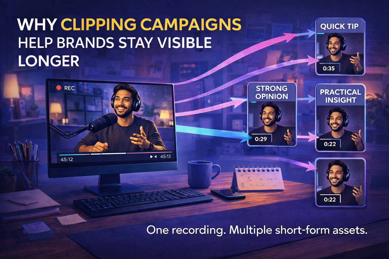 A clipping campaign helps a brand take one long-form recording and turn it into multiple short-form assets that can be published over time. Instead of expecting one upload to create all the attention, the brand creates several smaller touchpoints that keep the original idea active for longer.