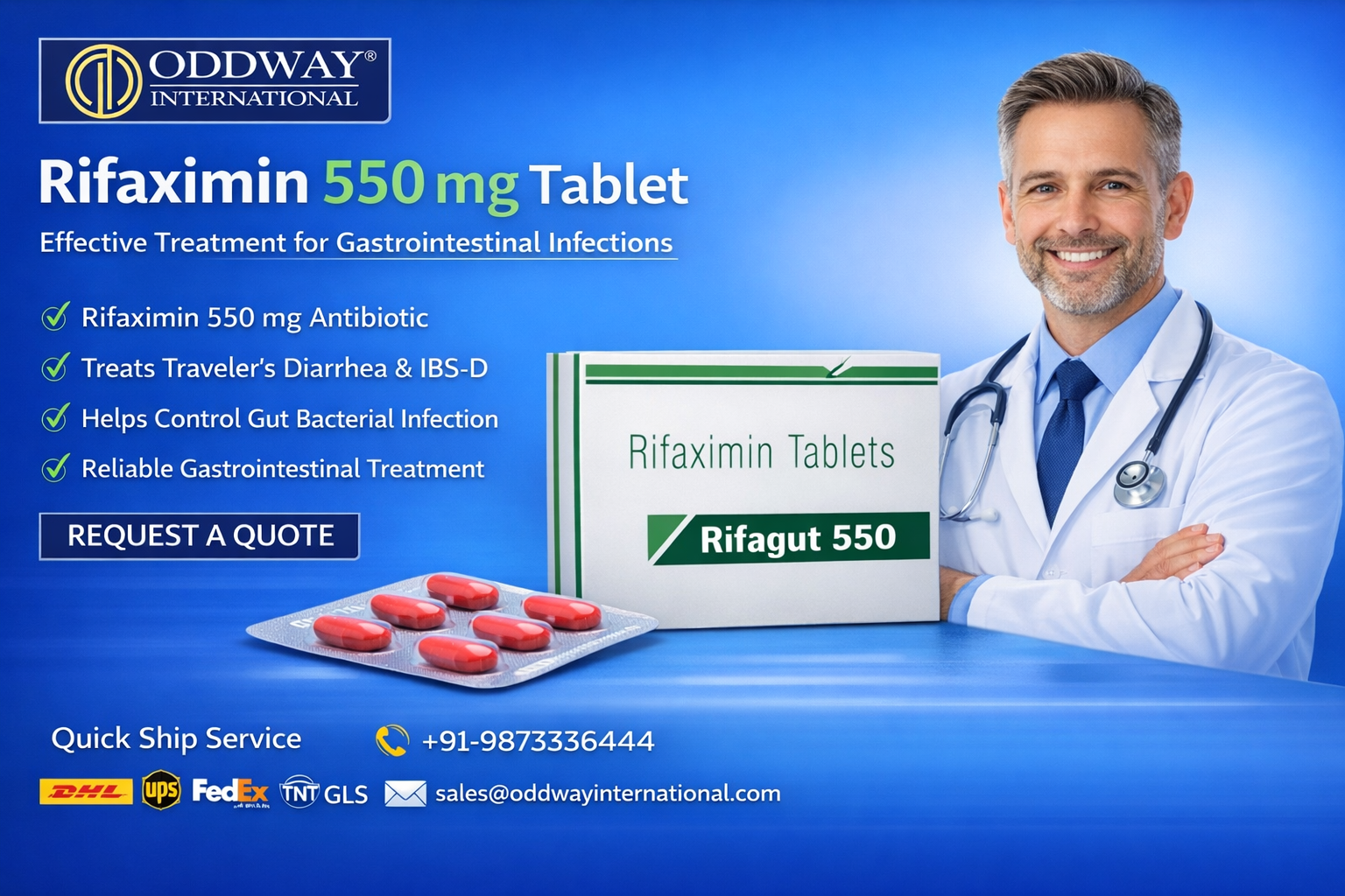 Oddway International enables Rifaximin 550 tablets to reach customers around the world because the company provides B2B clients with its top-quality pharmaceutical products. The company enables healthcare organizations and distribution companies to obtain vital gastrointestinal medication through its extensive distribution system which delivers dependable service at affordable rates.