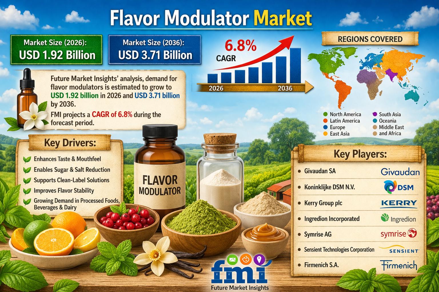 NEWARK, DE, United States – April 6, 2026 – The global flavor modulator market share is rapidly evolving into a critical enabling technology for food and beverage reformulation, supporting industry-wide efforts to reduce sugar, sodium, and fat without compromising taste. According to the latest strategic outlook by Future Market Insights (FMI), the flavor modulator market—valued at USD 1.80 billion in 2025—is projected to reach USD 1.92 billion in 2026 and further expand to USD 3.71 billion by 2036, registering a CAGR of 6.8% during the forecast period.
