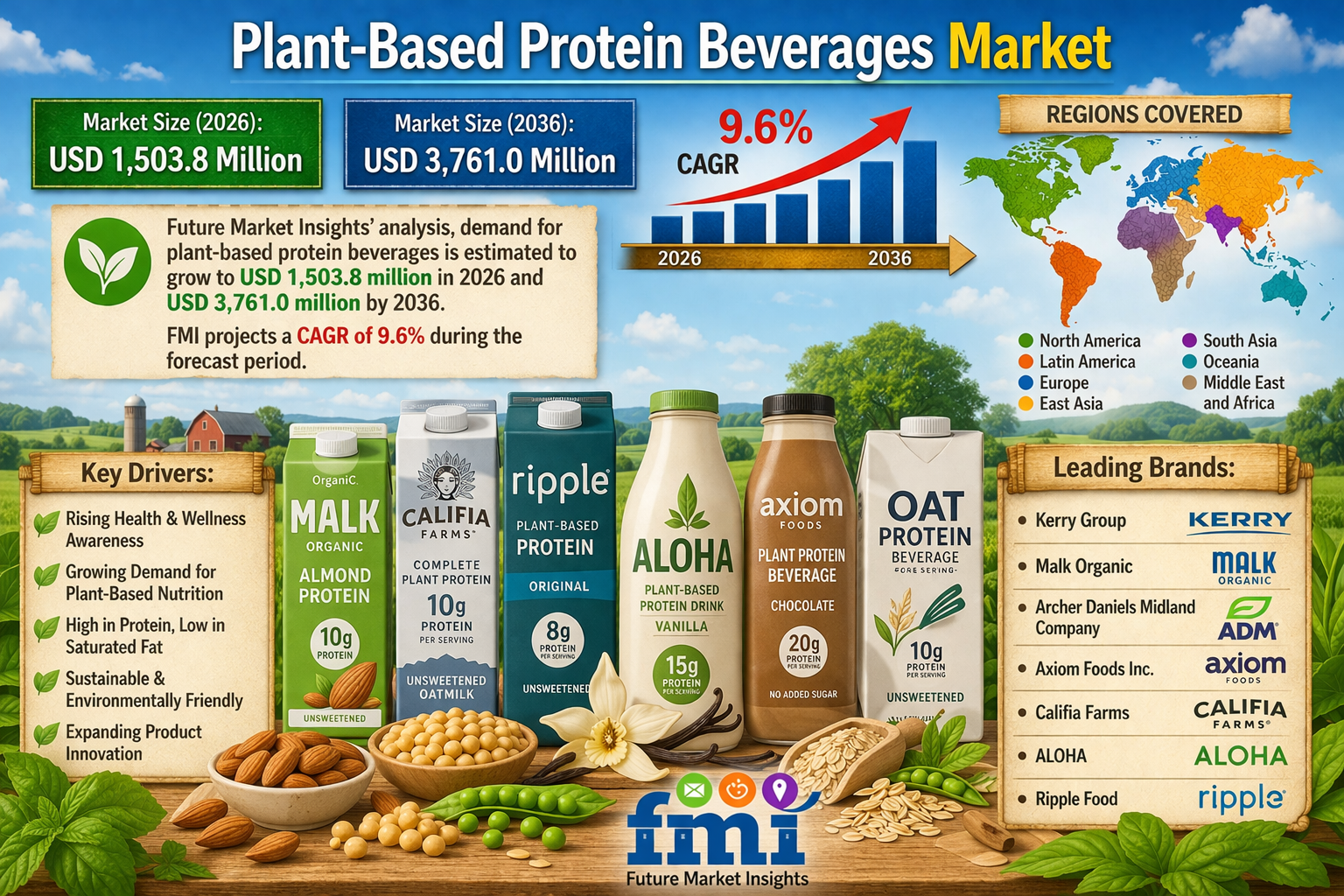 NEWARK, DE, United States – March 6, 2026 – The global plant-based protein beverages market is undergoing rapid transformation, evolving from a niche health segment into a mainstream category within sports nutrition and active lifestyle consumption. According to the latest analysis by Future Market Insights (FMI), the market is projected to grow from USD 1,503.8 million in 2026 to USD 3,761.0 million by 2036, reflecting a robust CAGR of 9.6% during the forecast period.