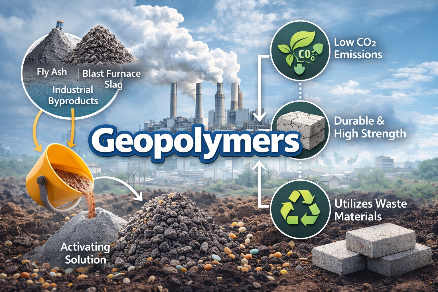 - Development of multi-functional geopolymers for fire resistance, high strength, and chemical resistance.
