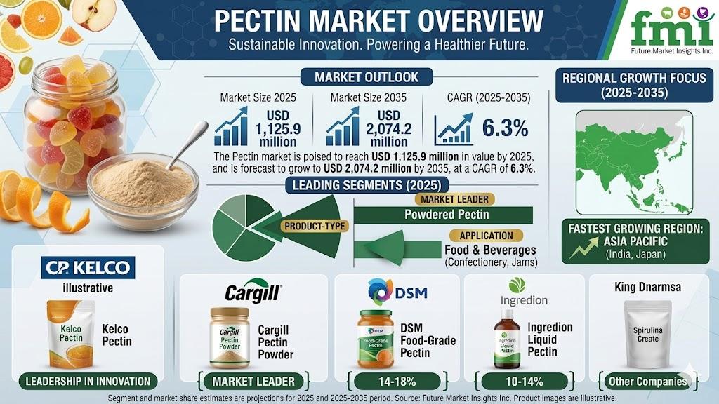NEWARK, Del., USA | April 8, 2026 — According to the latest market analysis by Future Market Insights, the global pectin market is experiencing steady expansion driven by targeted innovation, regulatory shifts, and evolving industrial applications. Valued at USD 1,125.9 million in 2025, the market is projected to reach USD 2,074.2 million by 2035, growing at a CAGR of 6.3%. Increasing demand for clean-label ingredients, reduced-sugar formulations, and functional food solutions is positioning pectin as a critical component across food, pharmaceutical, and personal care industries.