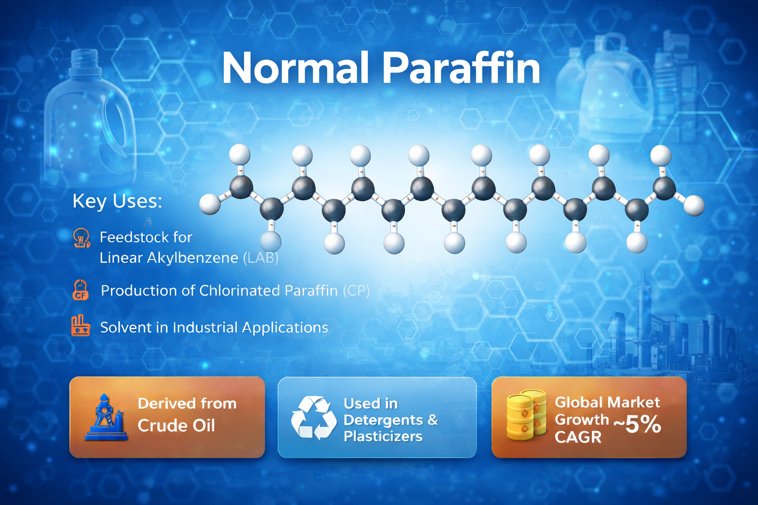 Normal paraffin is a straight chain hydrocarbon derived from crude oil refining and natural gas processing. It serves as a vital raw material in the production of detergents solvents lubricants and chemical intermediates. Its stable chemical structure and high purity make it suitable for a wide range of industrial applications, supporting its increasing adoption across global industries.