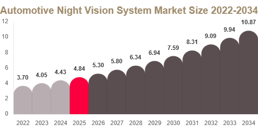As per Reed Intelligence report, the automotive night vision system market size for 2025 and 2034 along with CAGR values is included in the official study.
