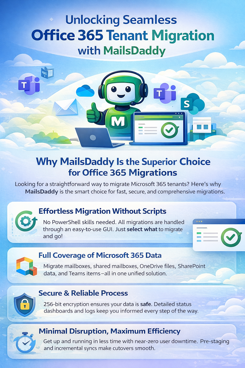 Managing a cross tenant migration service becomes easier with a solution designed for simplicity and performance. The MailsDaddy Tenant to Tenant Migration Solution provides a streamlined approach to complete tenant to tenant migration tasks. It supports accurate tenant to tenant mailbox migration, ensuring all data is transferred without loss. The solution maintains folder hierarchy and metadata during office 365 tenant to tenant migration.