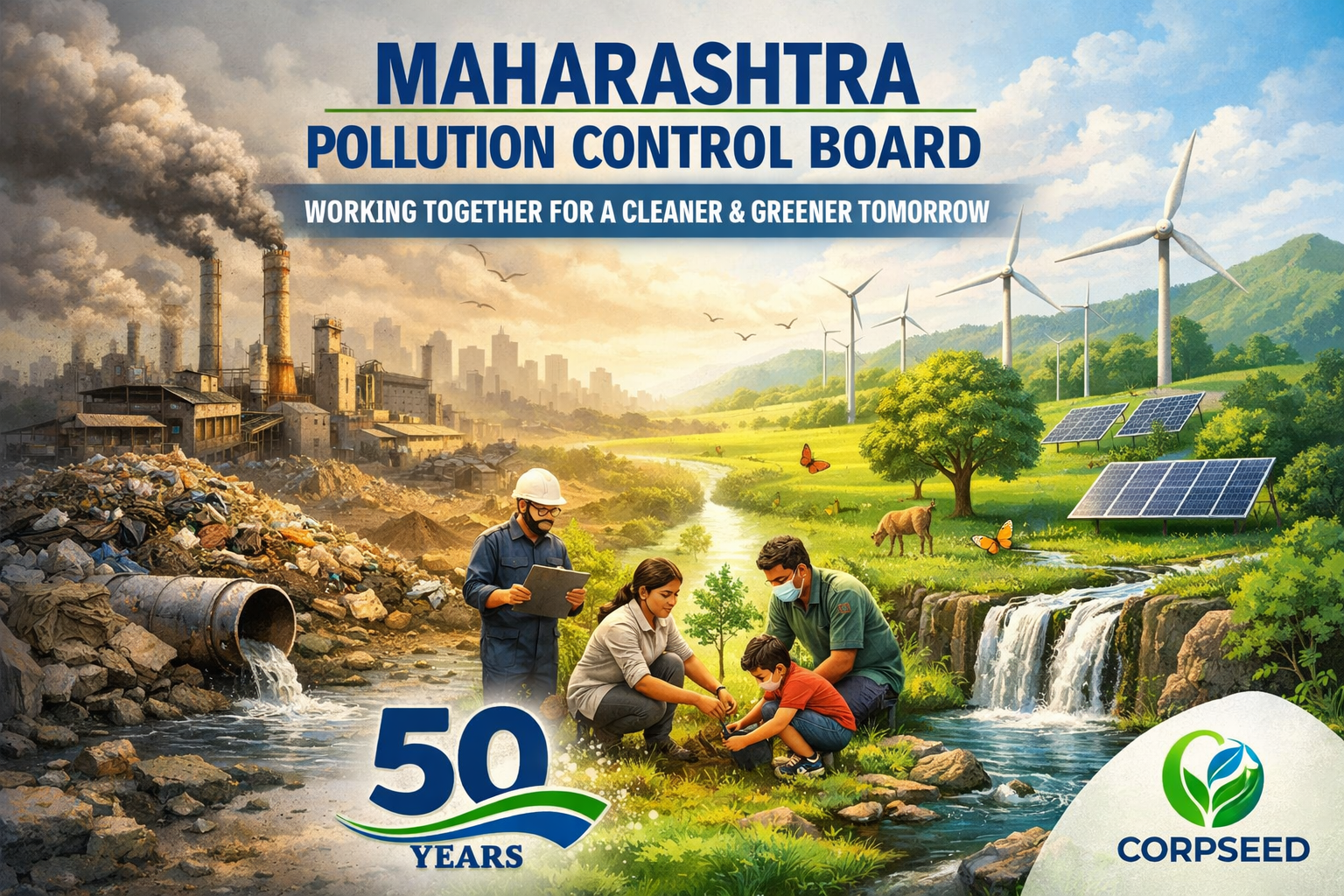 Visualize Maharashtra Pollution Control Board promoting clean air and water initiatives. Include environmental monitoring, eco-friendly practices, waste management, and greenery.