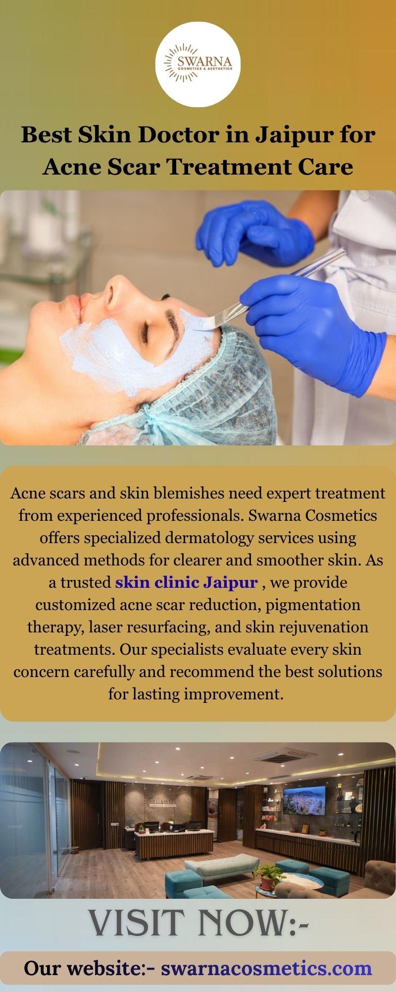 Acne scars and skin blemishes need expert treatment from experienced professionals. Swarna Cosmetics offers specialized dermatology services using advanced methods for clearer and smoother skin. As a trusted skin clinic Jaipur , we provide customized acne scar reduction, pigmentation therapy, laser resurfacing, and skin rejuvenation treatments. Our specialists evaluate every skin concern carefully and recommend the best solutions for lasting improvement. With modern equipment and proven procedures, we help patients regain confidence through safe and effective skincare treatments tailored to their unique needs. Visit us:- https://swarnacosmetics.com/Best Skin Doctor in Jaipur for Acne Scar Treatment Care Acne scars and skin blemishes need expert treatment from experienced professionals. Swarna Cosmetics offers specialized dermatology services using advanced methods for clearer and smoother skin. As a trusted skin clinic Jaipur , we provide customized acne scar reduction, pigmentation therapy, laser resurfacing, and skin rejuvenation treatments. Our specialists evaluate every skin concern carefully and recommend the best solutions for lasting improvement. With modern equipment and proven procedures, we help patients regain confidence through safe and effective skincare treatments tailored to their unique needs. Visit us:- https://swarnacosmetics.com/0 Commenti ·0 condivisioni ·5 Views ·0 Anteprima -