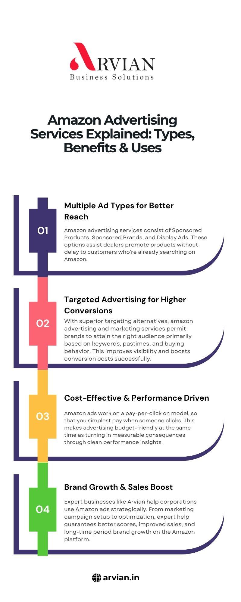 Amazon Advertising Services Explained: Types, Benefits & Uses 1. Multiple Ad Types for Better Reach Amazon advertising services consist of Sponsored Products, Sponsored Brands, and Display Ads. These options assist dealers promote products without delay to customers who're already searching on Amazon. 2. Targeted Advertising for Higher Conversions With superior targeting alternatives, amazon advertising and marketing services permit brands to attain the right audience primarily based on keywords, pastimes, and buying behavior. This improves visibility and boosts conversion costs successfully. 3. Cost-Effective & Performance Driven Amazon ads work on a pay-per-click on model, so that you simplest pay when someone clicks. This makes advertising budget-friendly at the same time as turning in measurable consequences through clean performance insights. 4. Brand Growth & Sales Boost Expert businesses like Arvian help corporations use Amazon ads strategically. From marketing campaign setup to optimization, expert help guarantees better scores, improved sales, and long-time period brand growth on the Amazon platform. Visit Us - https://arvian.in/amazon-ppc-advertising-management-service.php