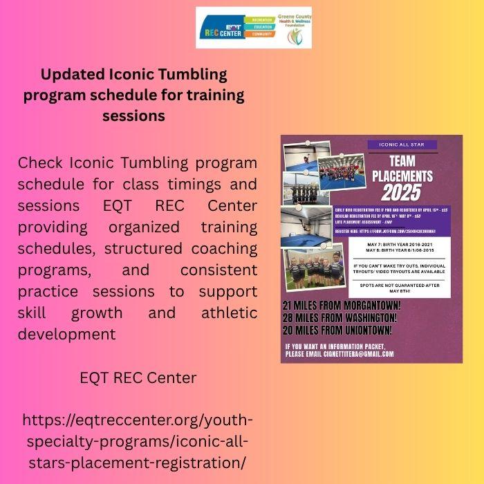 Check Iconic Tumbling program schedule for class timings and sessions EQT REC Center providing organized training schedules, structured coaching programs, and consistent practice sessions to support skill growth and athletic development