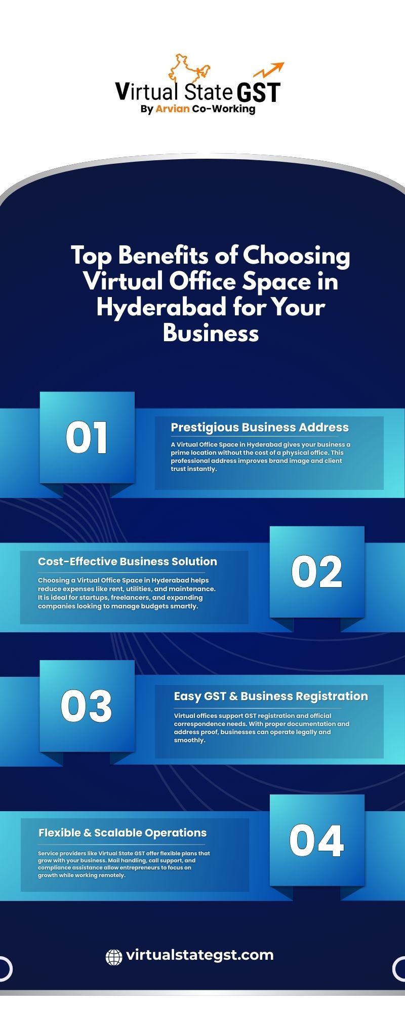 Top Benefits of Choosing Virtual Office Space in Hyderabad for Your Business 1. Prestigious Business Address A Virtual Office Space in Hyderabad gives your business a prime location without the cost of a physical office. This professional address improves brand image and client trust instantly. 2. Cost-Effective Business Solution Choosing a Virtual Office Space in Hyderabad helps reduce expenses like rent, utilities, and maintenance. It is ideal for startups, freelancers, and expanding companies looking to manage budgets smartly. 3. Easy GST & Business Registration Virtual offices support GST registration and official correspondence needs. With proper documentation and address proof, businesses can operate legally and smoothly. 4. Flexible & Scalable Operations Service providers like Virtual State GST offer flexible plans that grow with your business. Mail handling, call support, and compliance assistance allow entrepreneurs to focus on growth while working remotely. Visit Us - https://virtualstategst.com/virtual-office-in-hyderabad.php